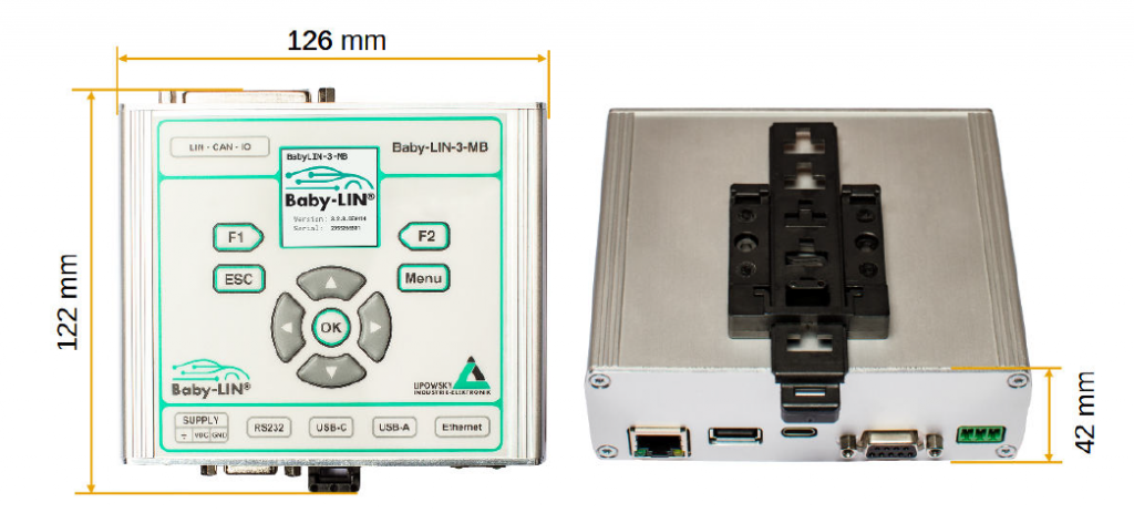 Baby-LIN-3-MB Descripción El Baby-LIN-3-MB es un sistema de simulación LIN y CAN con interfaz RS-232 y Ethernet. Esto le permite ampliar su PLC con protocolos de red y funciones de mantenimiento remoto para una actualización a la industria 4.0. Gracias a la posibilidad de alternar entre múltiples configuraciones de bus y a su amplia gama de funciones y posibles extensiones, el Baby-LIN-3-MB puede personalizarse para diversas aplicaciones. Se pueden almacenar varios SDF en la unidad flash interna. Al menos 1 GB reservado para SDF específicos del usuario La pantalla integrada de 1,54" y el teclado permiten una fácil configuración de los parámetros de red o la selección de SDF. Un SAI (sistema de alimentación ininterrumpida) integrado permite el apagado seguro del sistema durante fallos de alimentación o lo mantiene en funcionamiento en breves caídas de tensión. El Baby-LIN-3-MB cuenta con puertos internos para hasta dos interfaces de extensión. Estos puertos de extensión (ExPORT) permiten la modularización del dispositivo. Especificaciones técnicas Dispositivo Alimentación: 8-50 VCC Alimentación mediante conector de 3 pines (MC 1,5/3-ST-3,81) Teclado de membrana integrado con 9 teclas Pantalla a color IPS de 1,54" con resolución de 232 x 232 píxeles Reloj en tiempo real (RTC) de alta precisión con batería de respaldo CPU: ARM Cortex-A7 de doble núcleo a 650 MHz con 512 MB de RAM para el sistema Linux y las aplicaciones host, además de un procesador Cortex M7 a 480 MHz para la comunicación y las E/S Consumo típico de corriente: 200 mA a 24 VCC Aislamiento galvánico de todas las interfaces de comunicación con la fuente de alimentación UPS (sistema de alimentación ininterrumpida) integrado para evitar la pérdida de datos Interfaz: LIN 1 interfaz LIN-Bus disponible por defecto 1 interfaz LIN-Bus opcional disponible en el hardware, pero no activada 4 interfaces LIN-Bus disponibles mediante módulos de hardware. Se requieren extensiones de hardware adicionales. Conexión LIN-Bus mediante conector Sub-D de 25 pines; las extensiones utilizan su propio conector SUB-D9 Alimentación del LIN-Bus: 8-26 VCC Velocidad en baudios del bus LIN: hasta 115 200 baudios (compatible con protocolos fuera de la especificación LIN) Versiones LIN compatibles: V1.2, V1.3, ..., V2.2 Protocolos relacionados con LIN compatibles: Cooling y SAE J2602 Resistencia interna conmutable de 1 kΩ para emulación de nodo maestro Longitud máxima del cable de señal para LIN-Bus: 30 m Interfaz: CAN 2 interfaces CAN-HS-Bus según ISO-11898 con velocidades en baudios de datos de hasta 1 MBit/s Disponible en el hardware, pero no activado Ambas interfaces CAN-HS-Bus se pueden actualizar a CAN-FD-Bus según ISO-11898-1:2015 con velocidades de transmisión de datos de hasta 8 MBit/s Resistencia de terminación interna conmutable de 120Ω para cada interfaz Conexión CAN-FD-Bus mediante conector de 3 pines (MCVR 1,5/3-ST-3,81) El segundo bus CAN está aislado galvánicamente de los otros dos buses y del resto del sistema Longitud máxima del cable de señal para CAN-Bus: 30 m Interfaz: E/S Digitales de baja velocidad 3 entradas digitales Tensión de entrada de 5 V a 60 V Aislamiento galvánico del resto del sistema 1 interruptor de estado sólido con aislamiento eléctrico (máx. 32 V, máx. 190 mA) Interfaz: E/S Digitales de alta velocidad 4 entradas digitales de alta velocidad y salidas de lado alto; en tres de ellas, la entrada y la salida se combinan Compatible con frecuencias PWM de hasta 20 kHz con 5 pasos de ciclo de trabajo del 0,1 % Aislamiento galvánico del resto del sistema con fuente de alimentación propia Tensión de alimentación de 7 V a 50 V, que puede ser de tan solo 1 V solo para las salidas Máximo de 2,2 A para las cuatro salidas o una Medición de corriente (10 bits, 3 % de precisión) para la corriente de salida combinada Interfaz: USB 2 USB 2.0 de alta velocidad Interfaces (480 Mbit/s) a través de un conector USB-A y un conector USB-C Corriente máxima por puerto: 500 mA Sistemas de archivos compatibles: FAT-32, FAT-16 y exFAT USB-C permite añadir dispositivos Baby-LIN-3 adicionales (3) Interfaz: Ethernet Ethernet a través de conector RJ-45 Velocidad de transferencia: 10/100/1000 Mbit Función MDI-X automática Protocolo de comandos: TCP-IP en el puerto 10002 Interfaz web para eventos del dispositivo, información del sistema y carga sencilla de archivos SDF Compatible con EEE (Ethernet de eficiencia energética) Interfaz: RS232 Conexión en serie a través de conector hembra Sub-D-9 Velocidad de datos: 9600 baudios (predeterminado) a 115,2 kBaudios Bits de datos, bit de paridad, bit de parada: 8-N-1 Carcasa Grado de protección: IP20 Temperatura de funcionamiento: -20° a 60° Celsius. Peso: 410 g Dimensiones de la caja [mm]: 126 x 122 x 42 (largo x ancho x alto). Elementos como conectores, botones y el adaptador de montaje en riel de perfil de sombrero no están incluidos Montaje: Riel de perfil de sombrero (TS 35)