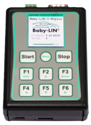 Baby-LIN-3-RC Descripción El Baby-LIN-3-RC es un simulador LIN compacto que incluye 9 botones libremente configurables, que se adaptan perfectamente al uso autónomo. El Baby-LIN-3-RC permite controlar dispositivos equipados con Lin-Bus El Baby-LIN-3-RC cuenta con un teclado de membrana integrado de 9 teclas y una pantalla a color ISP de 1,54" con 240x240 píxeles. Cada uno de los seis botones de función se puede asignar a cualquier comando; las teclas de Inicio y Detención, de mayor tamaño, permiten la ejecución rápida de macros u otras funciones. Se implementará un editor de interfaz gráfica de usuario fácil de usar en LINWorks para que los usuarios puedan mostrar elementos como señales de bus o resultados de macros directamente en la pantalla. El Baby-LIN-3-RC puede manejar voltajes LIN-Bus en el rango de 8-26 VCC, admite SDF-V3 y está preparado para SDF-V4. Especificaciones técnicas Dispositivo Alimentación: 8-26 VCC Alimentación mediante conector de 3 pines (MC 1,5/ 3-ST-3,81) o conector SUB-D9 macho Aislamiento galvánico de las interfaces de comunicación y del lado del conector USB CPU: ARM Cortex-M7, 480 MHz Memoria: 1 MB RAM Teclado de membrana integrado con 9 teclas Pantalla a color IPS de 1,54" con resolución de 232 x 232 píxeles Interfaz: USB Interfaz USB 2.0 de alta velocidad (480 Mbit/s) Conexión mediante conector USB-C Interfaz: LIN 1 interfaz LIN-Bus disponible 1 LED rojo/verde (LED1) para mostrar el estado del LIN-Bus y la tensión de alimentación Conexión LIN-Bus mediante conector de 3 pines (MCVR 1,5/3-ST-3,81) o conector SUB-D9 Alimentación del bus LIN: 8-26 VCC Velocidad en baudios del bus LIN: hasta 115 200 baudios (compatible con protocolos fuera de la especificación LIN) Versiones LIN compatibles: V1.2, V1.3, ..., V2.2 Protocolos relacionados con LIN compatibles: Cooling y SAE J2602 Longitud máxima del cable de señal para LIN-Bus: 30 m Carcasa Grado de protección: IP20 Temperatura de funcionamiento: -20° a 60° Celsius. Peso: 110 g Dimensiones de la caja [mm]: 92 x 66 x 28 (largo x ancho x alto), conectores externos no incluidos Otros productos Lipowsky Baby-LIN-3-Single Baby-LIN-3-Dual Baby-LIN-3-RCplus Baby-LIN-RM-III Baby-LIN-3-MB