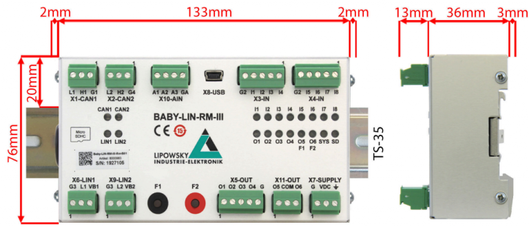 Baby-LIN-RM-III Descripción El Baby-LIN-RM-III es un dispositivo que combina LIN y CAN-Bus para una fácil conexión a sistemas EOL basados en PLC. Con entradas y salidas digitales y la extensión a compatibilidad con CAN-FD, se proporcionan todas las interfaces. El Baby-LIN-RM-III puede funcionar con LIN y CAN-Bus. El Baby-LIN-RM-III incluye 8 DI, 3 AI y 6 DO. Dos de las DI pueden leer, escalar y mapear señales PWM (modulación por ancho de pulso) a señales de bus. El Baby-LIN-RM-III ofrece dos botones programables. Las interfaces CAN-Bus del Baby-LIN-RM-III admiten CAN-FD y son compatibles con CAN-HS. Especificaciones técnicas Dispositivo Alimentación: 7-32 VCC Alimentación mediante conector de 3 pines (MC 1,5/3-ST-3,81) 6 LED multicolor rojo/verde: Dispositivo de señal, tarjeta microSD y estados de bus LIN y CAN 2 LED: Se utilizan como indicador de salida digital, indicador de pulsador o libremente programables 12 LED: Se utilizan como indicador de señal para entradas y salidas digitales 2 pulsadores libremente programables Reloj en tiempo real (con batería) CPU: ARM Cortex-M7, 300 MHz Memoria: 32 MB RAM Consumo máximo de corriente: 70 mA a 24 VCC Aislamiento galvánico de todas las interfaces de comunicación (bus LIN y CAN, USB, excepto 4 de las 6 salidas digitales) Interfaz: LIN 1 interfaz LIN-Bus disponible por defecto 1 interfaz LIN-Bus opcional disponible en el hardware, pero no activada Conexión LIN-Bus mediante conector de 3 pines (MCVR 1,5/3-ST-3,81) Alimentación del LIN-Bus: 8-26 VCC Velocidad en baudios del bus LIN: hasta 115 200 baudios (compatible con protocolos fuera de la especificación LIN) Versiones LIN compatibles: V1.2, V1.3, ..., V2.2 Protocolos relacionados con LIN compatibles: Cooling y SAE J2602 Longitud máxima del cable de señal para LIN-Bus: 30 m Interfaz: CAN 2 interfaces CAN-FD-Bus según ISO-11898-1:2015 con velocidades en baudios de datos de hasta 8 MBit/s Disponible en el hardware, pero no activado Ambas interfaces CAN-FD-Bus se pueden utilizar como interfaces de alta velocidad (CAN-HS) según la norma ISO-11898 Una interfaz CAN-FD-Bus se puede utilizar como interfaz de baja velocidad con tolerancia a fallos (CAN-LS) según la norma ISO-11519 Conexión CAN-FD-Bus mediante conector de 3 pines (MCVR 1,5/3-ST-3,81) Velocidad máxima en baudios: CAN-FD: 8 MBit/s, CAN-HS: 1 MBit/s, CANLS: 125 kBit/s Longitud máxima del cable de señal para CAN-Bus: 30 m Interfaz: E/S Digitales 8 entradas digitales 4 salidas digitales de lado bajo 2 salidas digitales aisladas eléctricamente E/S digitales disponibles a través de 3 conectores de 5 pines (MCVR 1,5/5-ST-3,81) y 1 conector de 3 pines (MCVR 1,5/3-ST-3,81) 2 entradas digitales para leer señales PWM 4 salidas digitales para emitir señales PWM Interfaz: E/S Analógicas 3 entradas analógicas aisladas eléctricamente Rango de medición de hasta 25 V, tolerancia de tensión de hasta 33 V E/S analógicas disponibles a través de un conector de 4 pines (MC 1,5/4-ST-3,81) Interfaz: USB Interfaz USB 2.0 de alta velocidad Conexión mediante conector USB B-mini Interfaz: microSD Tipos de tarjeta compatibles: tarjetas microSD, tarjetas microSDHC Sistema de archivos compatible: FAT-32, FAT-16 Tamaño máximo de la tarjeta: 32 GB Está previsto utilizar la ranura para tarjetas microSD para el registro en el futuro Carcasa Grado de protección: IP20 Temperatura de funcionamiento: -20° a 60° Celsius. Peso: 250 g Dimensiones de la caja [mm]: 136 x 76 x 36 (largo x ancho x alto). Elementos como conectores, botones y el adaptador de montaje en riel de perfil de sombrero no están incluidos Montaje: Riel de perfil de sombrero (TS 35) Otros productos Lipowsky Baby-LIN-3-Single Baby-LIN-3-Dual Baby-LIN-3-RC Baby-LIN-3-RCplus Baby-LIN-3-MB